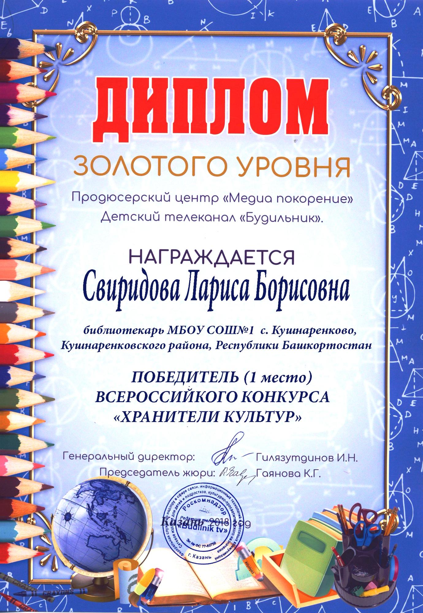 В 2018 году педагог-библиотекарь нашей школы Свиридова Л.Б. приняла участие во Всероссийском конкурсе школьных библиотек «Хранители культур», где заняла 1 место и стала победителем.